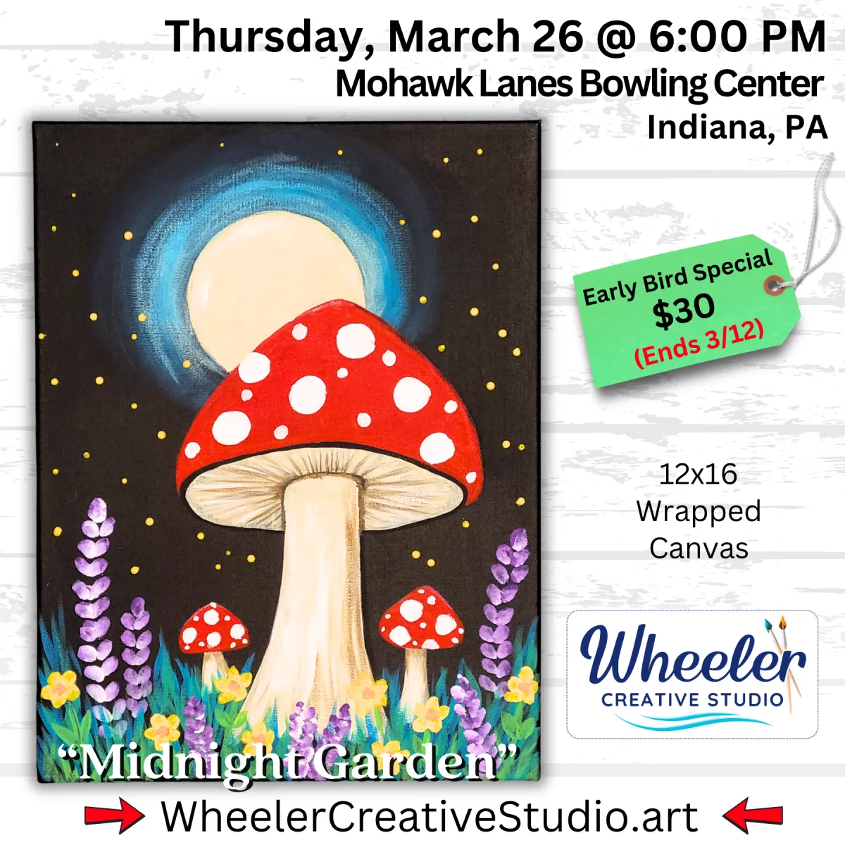 Join us for Midnight Garden, a relaxing creative workshop where you'll paint this glowing moonlit scene with easy step-by-step guided instruction. No experience needed. Just bring a friend, unwind, and enjoy a creative evening hosted by Wheeler Creative Studio at Mohawk Lanes Bowling Center in Indiana, PA.
